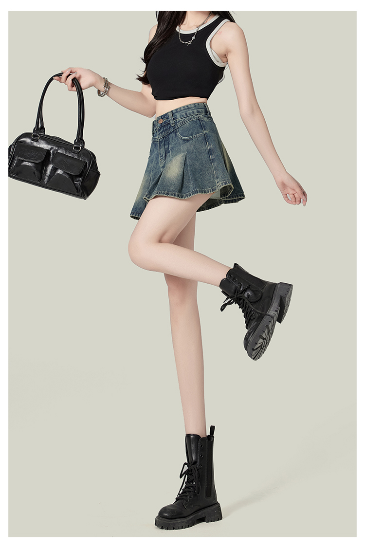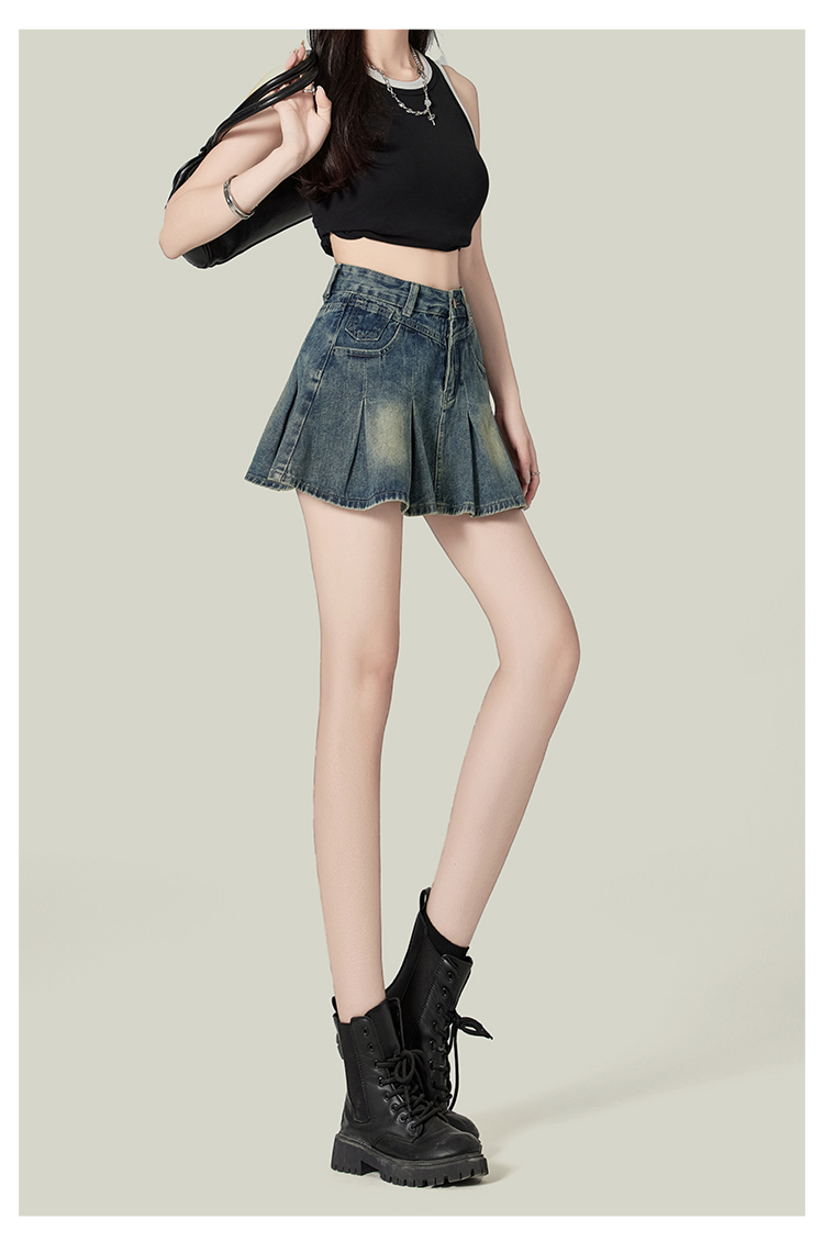 Forever21复古蓝辣妹包臀百褶牛仔短裙女高腰A字蓬蓬裙梨形半身裙